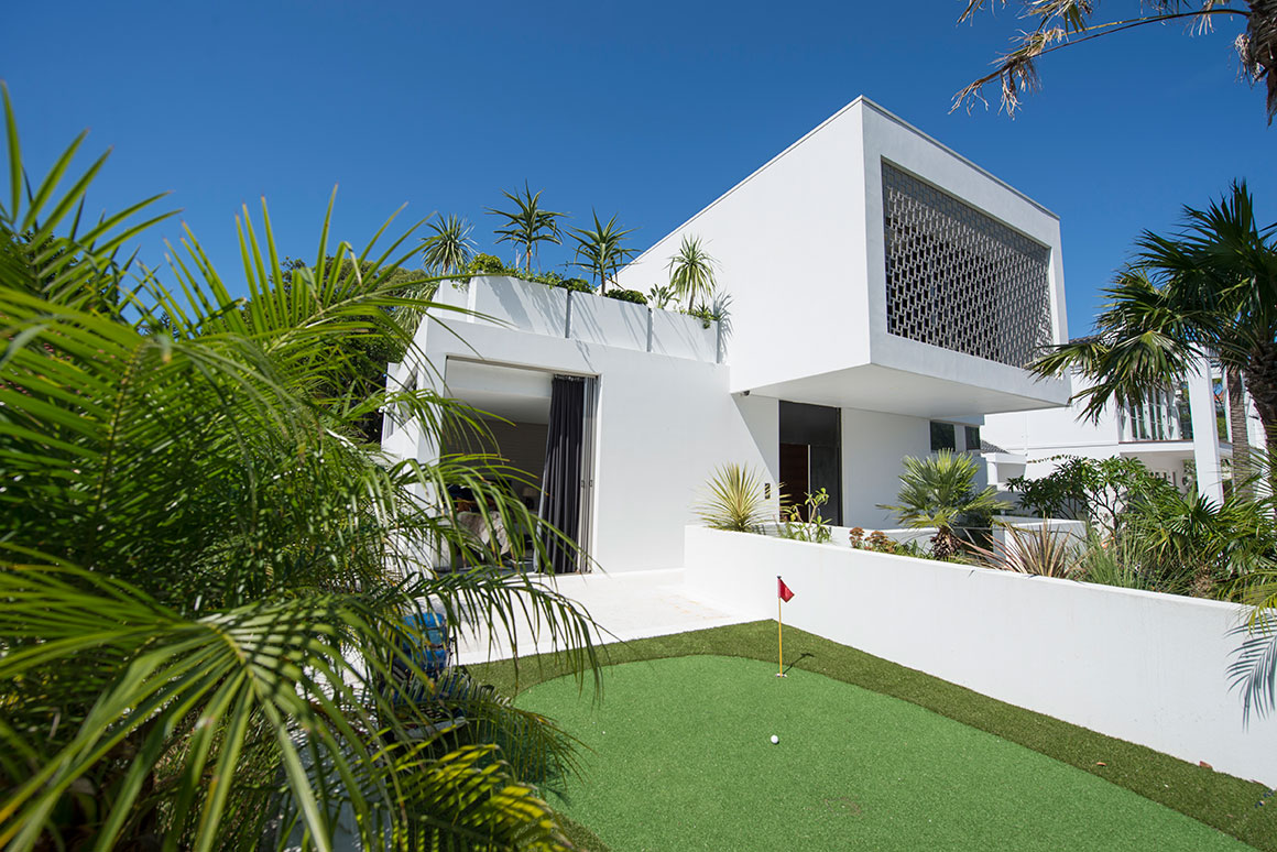 Rather than uniform colour saturation, the design uses dramatic accents to define each zone. For example, bold sky-blue seating mirrors outdoor pools, while bold yellow tones distinguish guest bathrooms from adjoining private quarters. The five-bedroomed house celebrates the relationship between indoor and outdoor, with striped back thresholds and generous glazing leading to landscaped terraces.