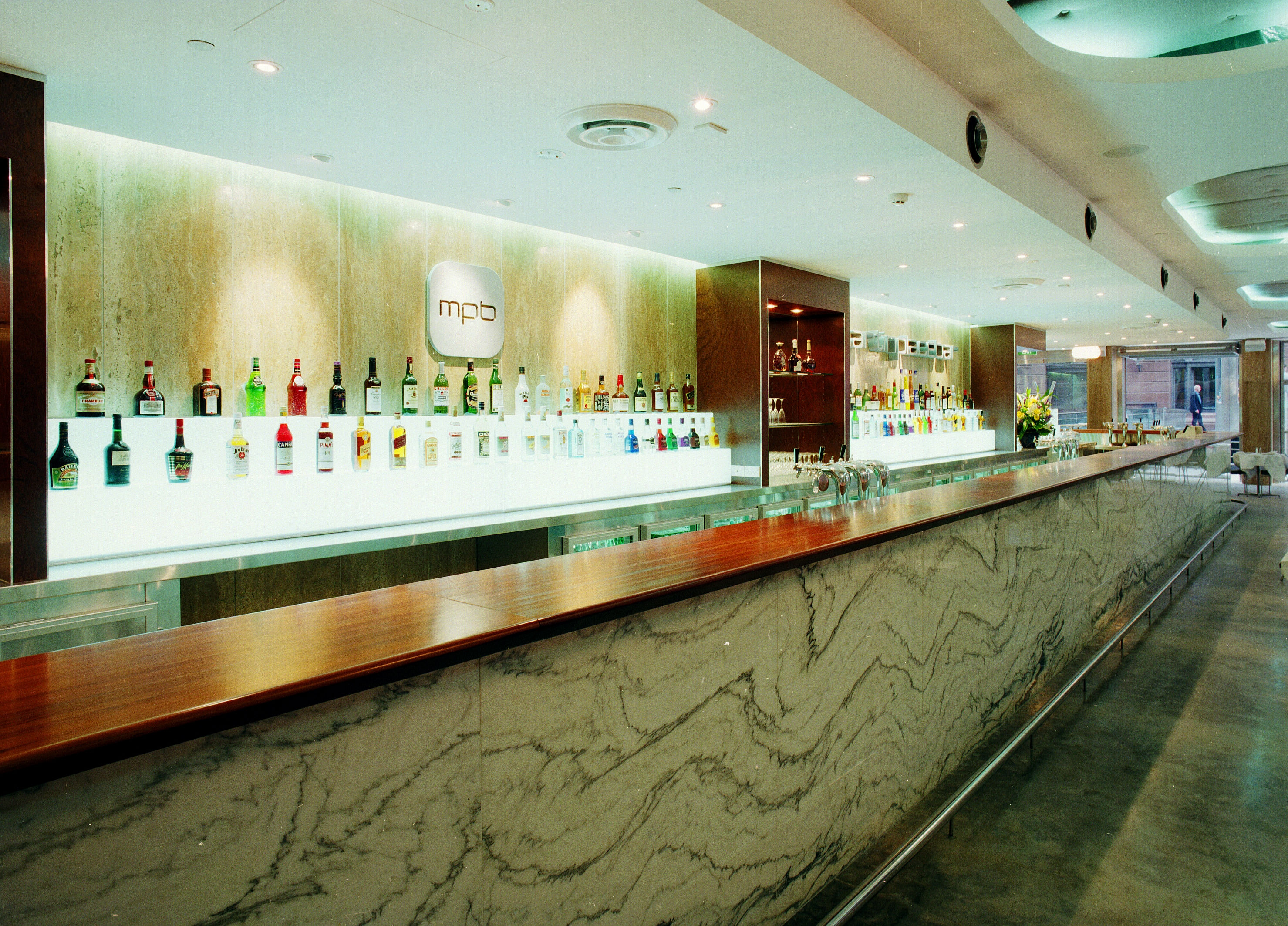 Acoustic ceilings balance the energy of the bar, softening the sound while maintaining a lively atmosphere. Behind the scenes, a considered operational layout with generous storage, bottle and garage chutes, ensures efficiency and ease of service.