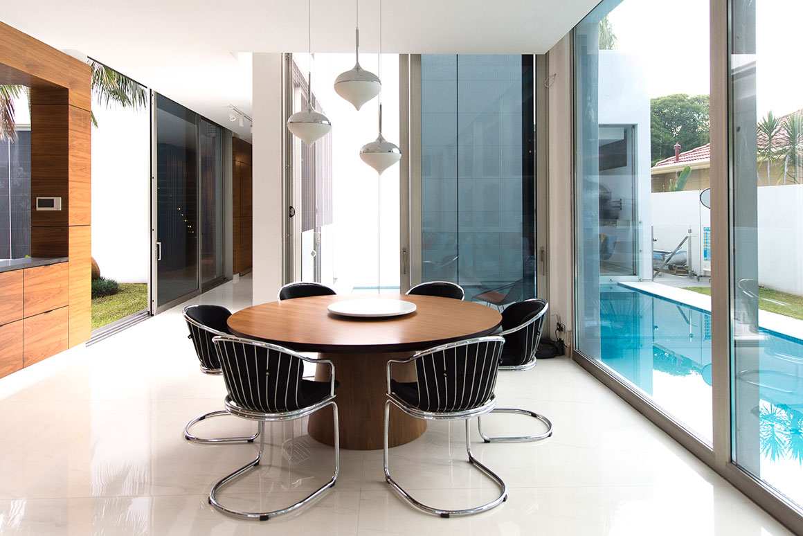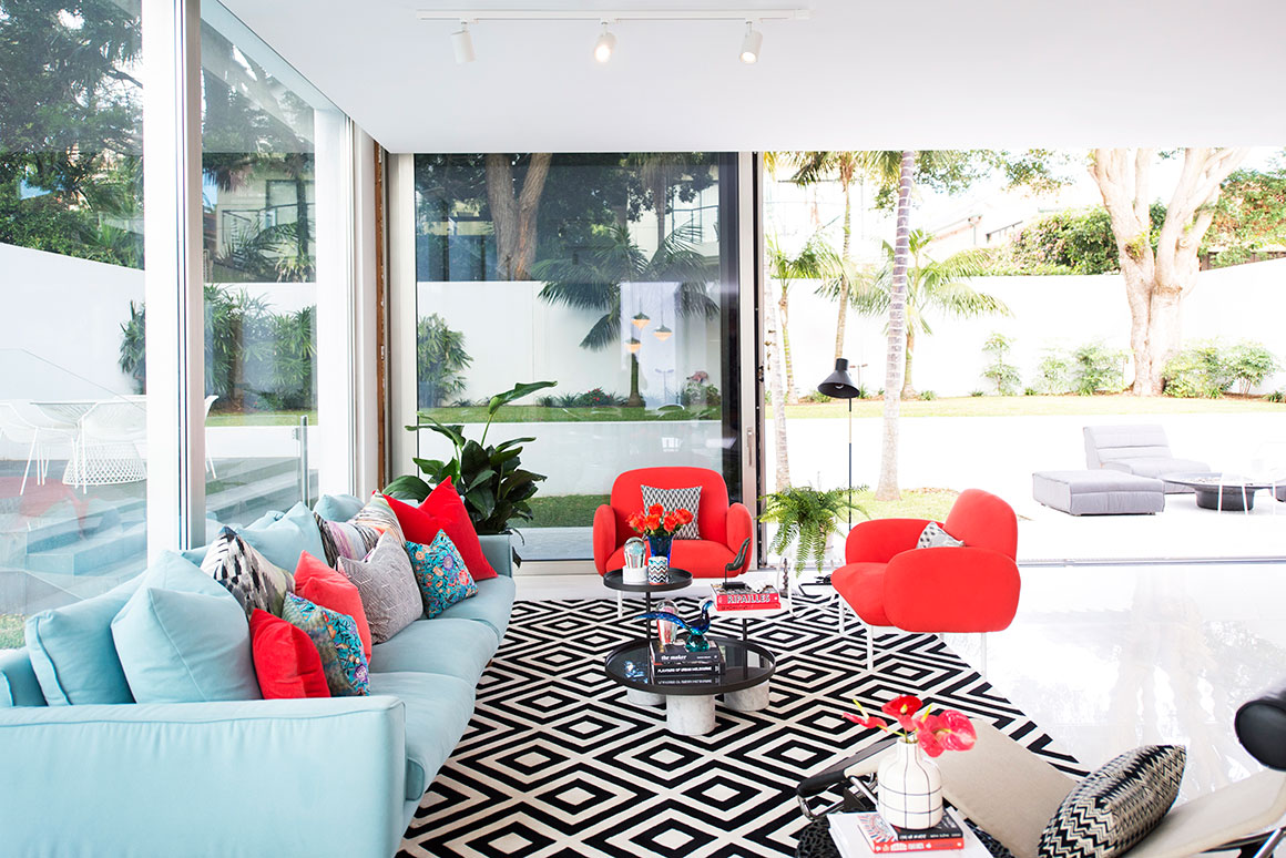 Rather than uniform colour saturation, the design uses dramatic accents to define each zone. For example, bold sky-blue seating mirrors outdoor pools, while bold yellow tones distinguish guest bathrooms from adjoining private quarters. The five-bedroomed house celebrates the relationship between indoor and outdoor, with striped back thresholds and generous glazing leading to landscaped terraces.