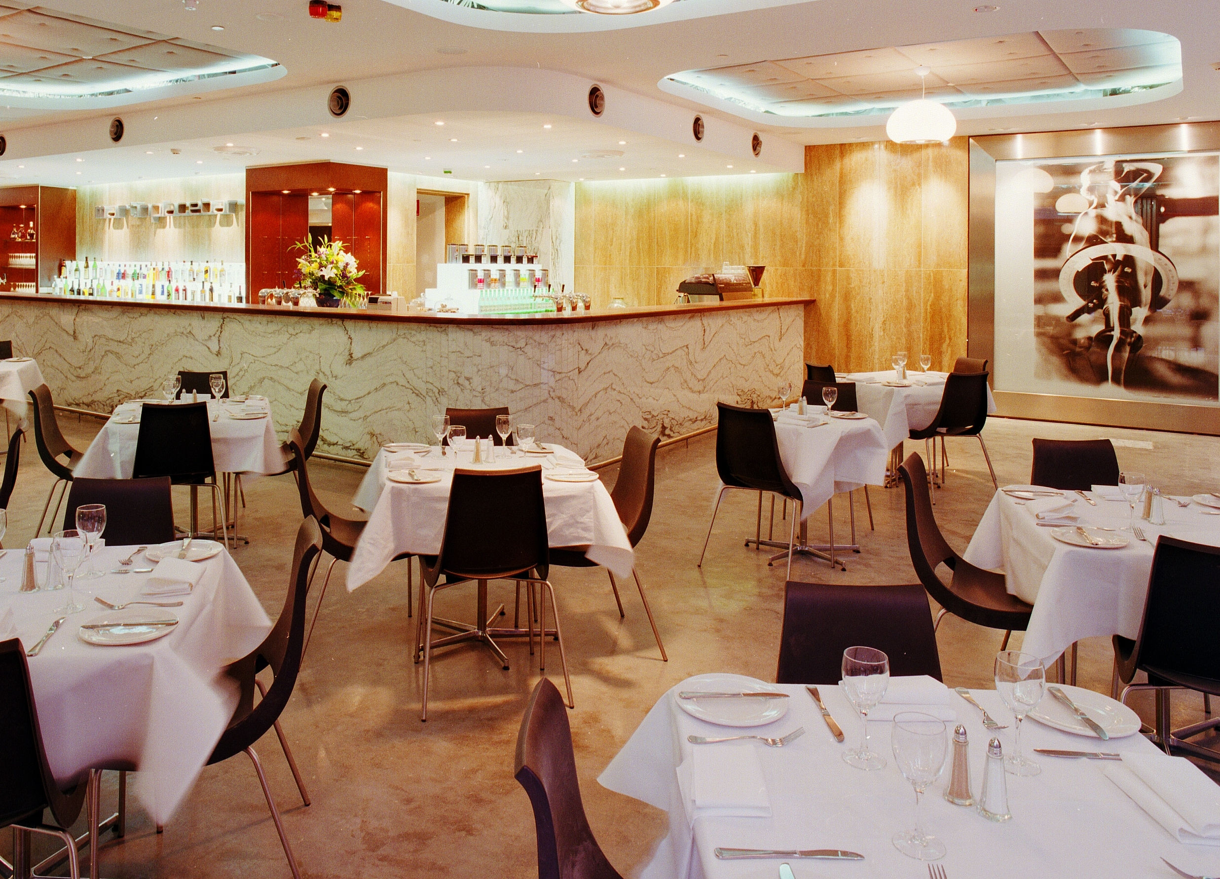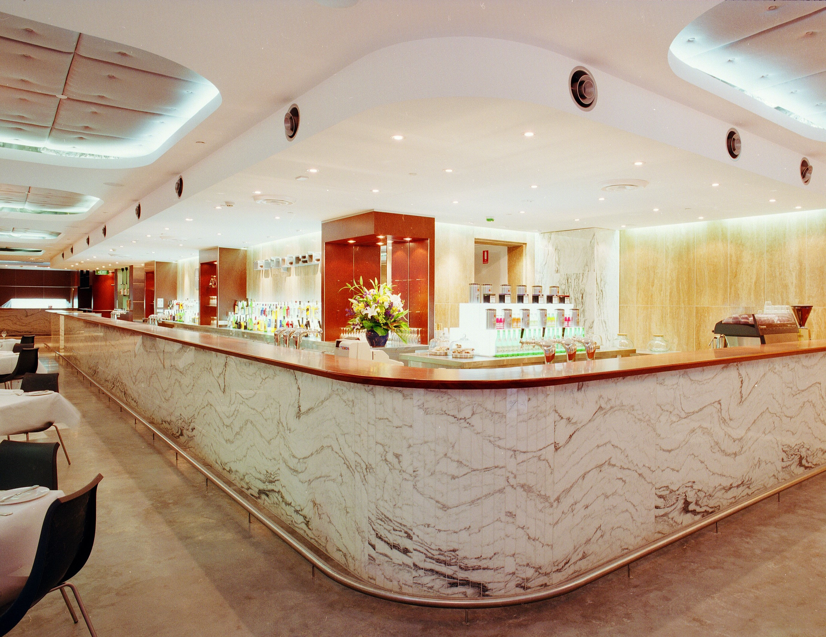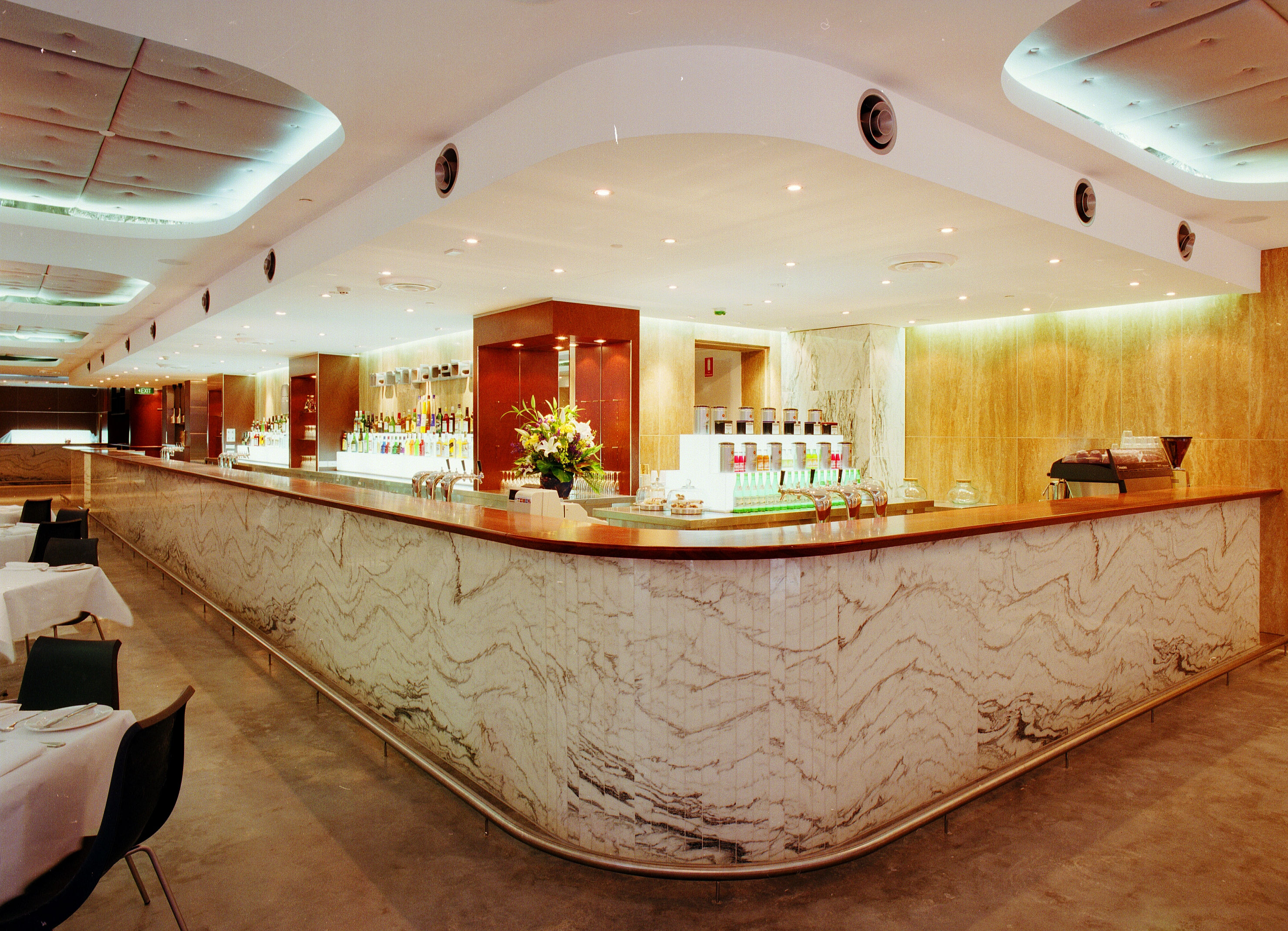 Acoustic ceilings balance the energy of the bar, softening the sound while maintaining a lively atmosphere. Behind the scenes, a considered operational layout with generous storage, bottle and garage chutes, ensures efficiency and ease of service.